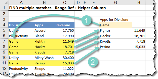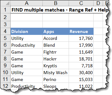 =IF(ROWS($E$5:E5) <= $F$3, INDEX(TableApp[[#All], [Apps]], F5), "")- The formula to determine matching related Revenue locations (starting in cell H5)