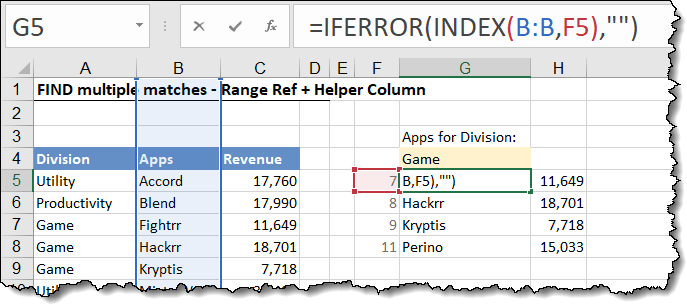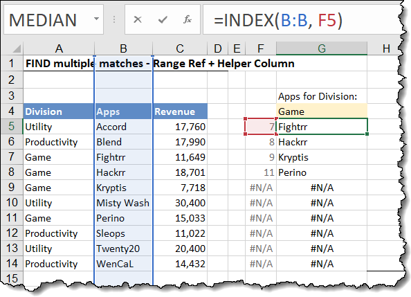 Starting in cell G5, we will use the INDEX function to return the App located on each discovered row.