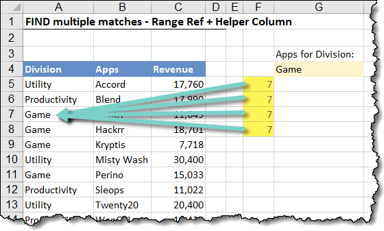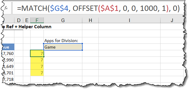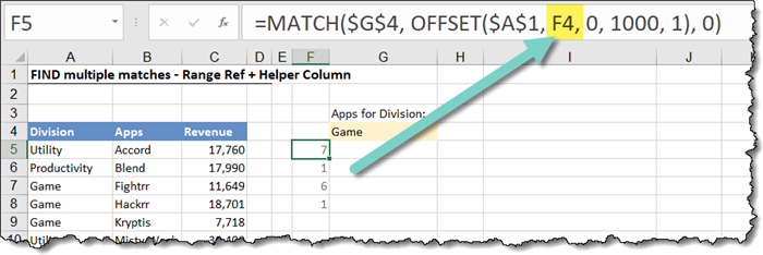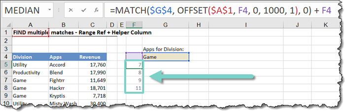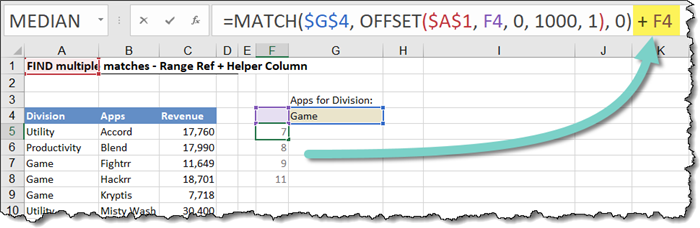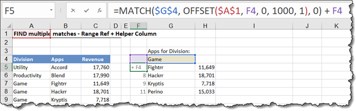 =MATCH($G$4, OFFSET($A$1, F4, 0, 1000, 1), 0) + F4The formula returns the discovered position (row number) for each App in the selected Division.