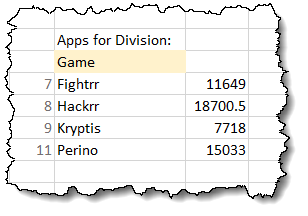 Our objective is to enter a Division in cell G4 and be presented with a list of Apps and their related Revenues.