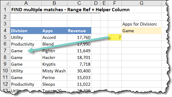 =MATCH($G$4, A:A, 0)We are informed that the Division “Game” is located on row 7.