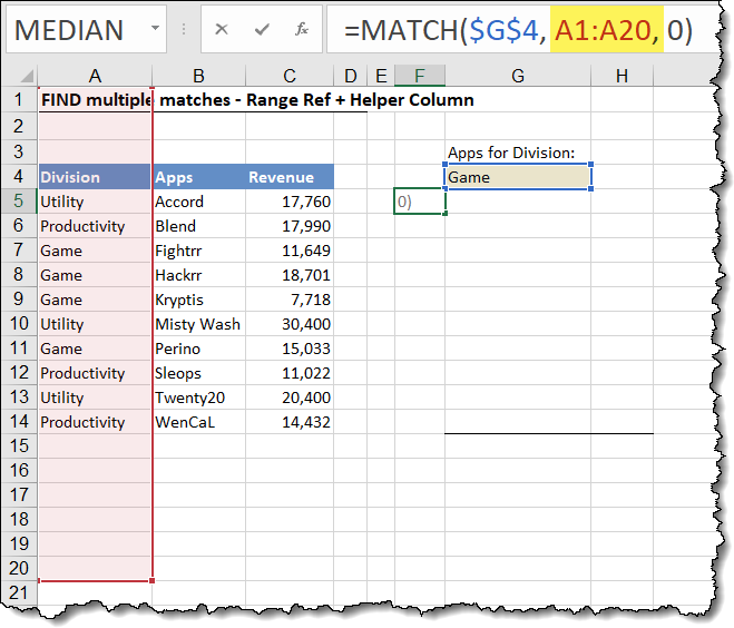 =MATCH($F$4, A:A, 0)Suppose we limit the search range from the entire column to just the cells we expect to see data, such as cell A1 through A20?