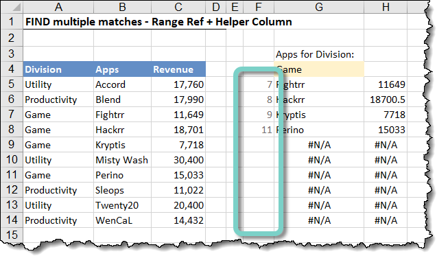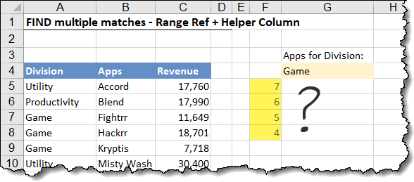=IF(ROWS($E$5:E5) <= $F$3, MATCH($G$4, OFFSET(TableApp[[#Headers], [Division]], F4, 0, ROWS(TableApp[Division]), 1), 0) + F4, "")NOTE: The formula looks much larger, but the logic is the same. Because Structured References take up more space than traditional cell references, the formula increases in character count but not strategy.