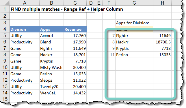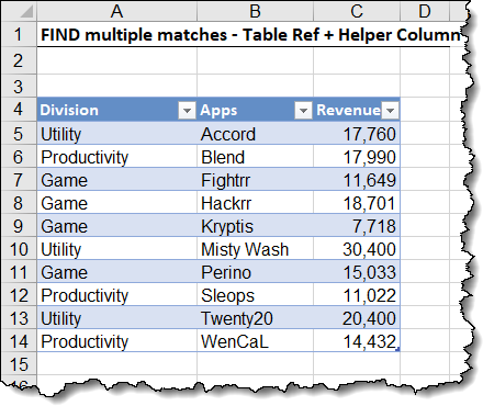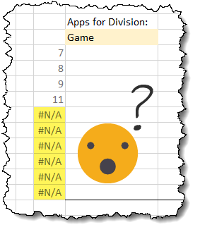 =IF(ROWS($F$5:F5) <= $F$4, INDEX(TableDiv[Apps], AGGREGATE(15, 3, (TableDiv[Division] = $G$4) / (TableDiv[Division] = $G$4) * (ROW(TableDiv[Division]) - ROW(TableDiv[[#Headers], [Division]])), ROWS($F$5:F5))), "")For related Revenue