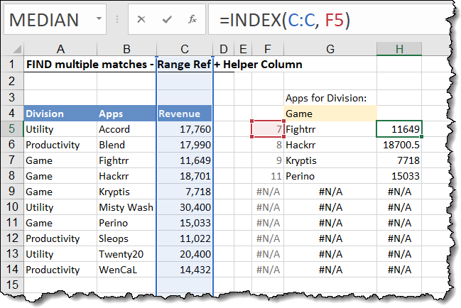 Returning each related revenue is performed the same way as the returned App name. The only difference is we search column C for the item to return.