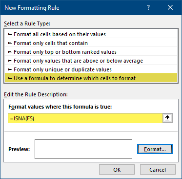 - Select Home (tab) -> Styles (group) -> Conditional Formatting -> New Rule -> “Use a formula to determine which cells to format”