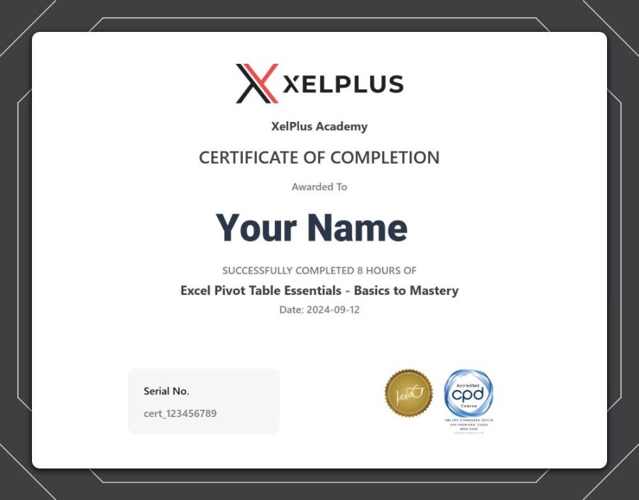When you finish the Excel Pivot Table Essentials course, you’ll get a certificate of completion.