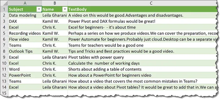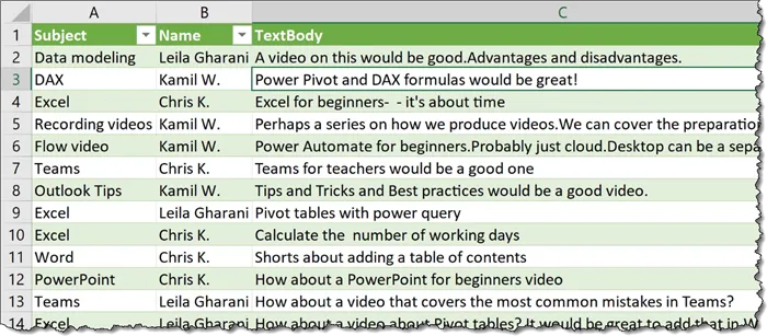 If I can send all these messages into an Excel Table, reading through and processing the messages will be a bit easier to manage.