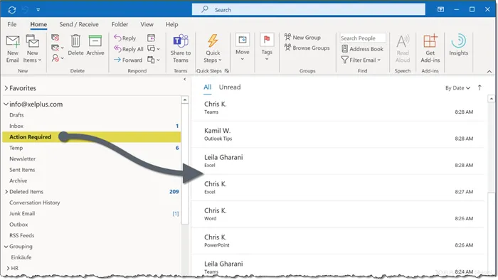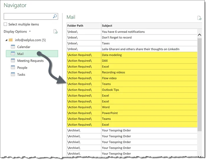 Take a look at my Outlook Inbox. We want to bring in only the messages stored in the “Action Required” folder below the main Inbox folder.
