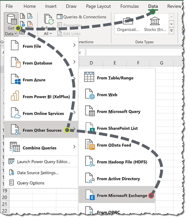 Select Data (tab) -> Get Data -> From Other Sources -> From Microsoft Exchange.