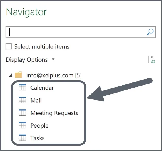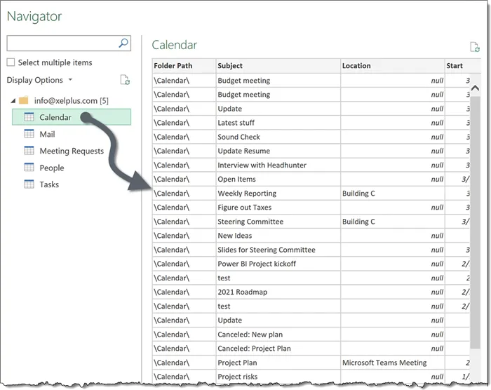 Power Query creates a connection to the Outlook mailbox and displays the top-level sections of the account.