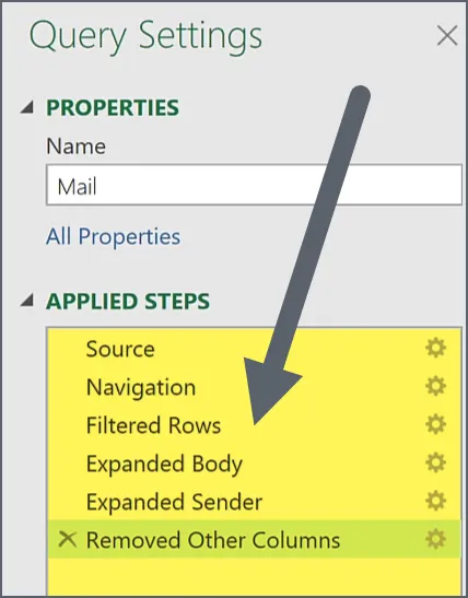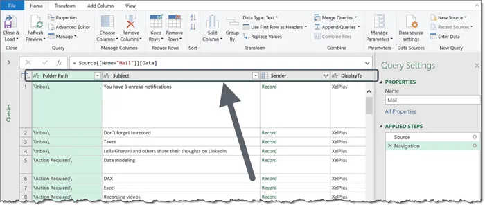 We’ll select the Mail table and click the Transform Data button to load the contents of the email into Power Query.