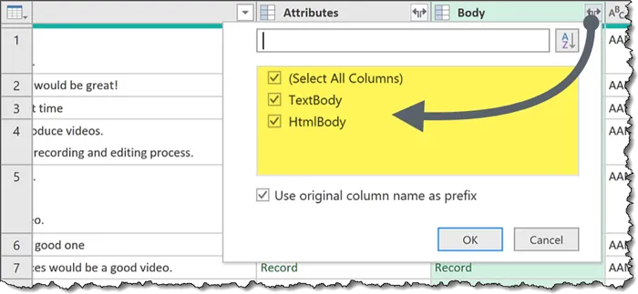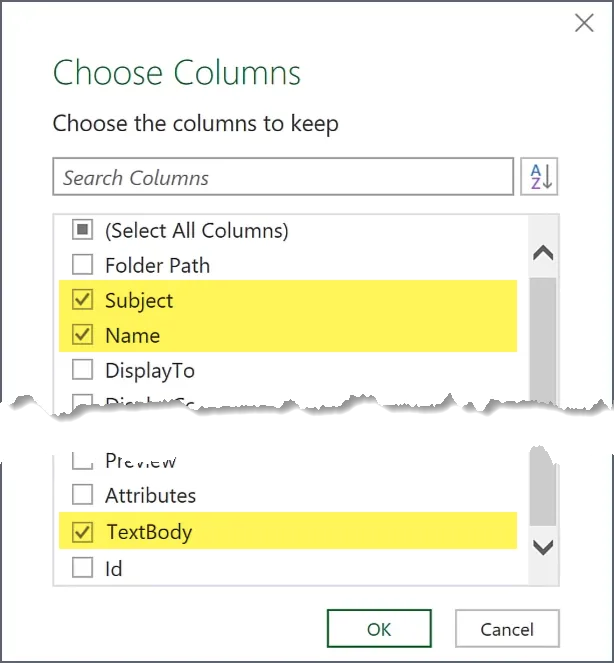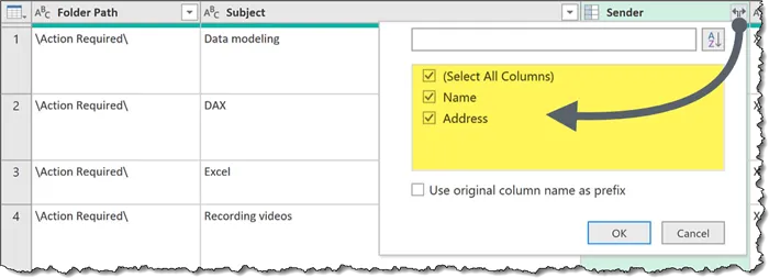 If we want to include the “Sender” information in the output table, we can click the Expand Table button at the top of the “Sender” column and click OK to extract the names and email addresses as additional columns in the current table.