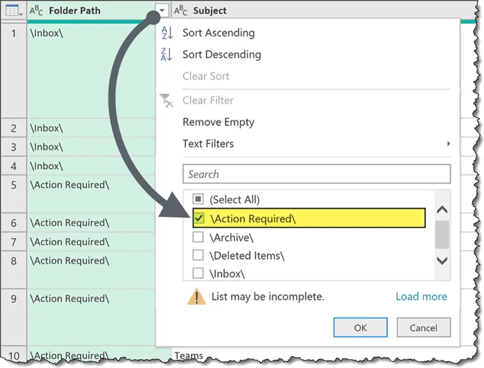 I want to filter the “Folder Path” column to only include messages from the “Action Required” subfolder.