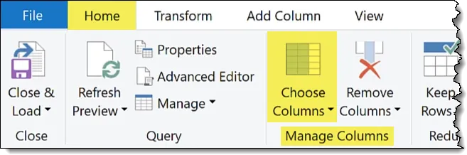 As the table contains many unneeded columns, an easy way to get rid of those columns is to use the Choose Columns feature located on the Home ribbon.