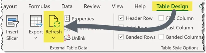 When a new message is received that meets the query criteria, we can click the Refresh button on the Data or Table Design ribbons (or right-click the table and select Refresh) to re-execute the query to bring in the latest messages.