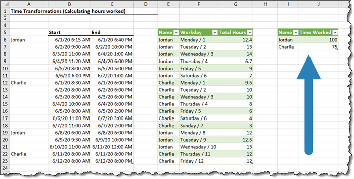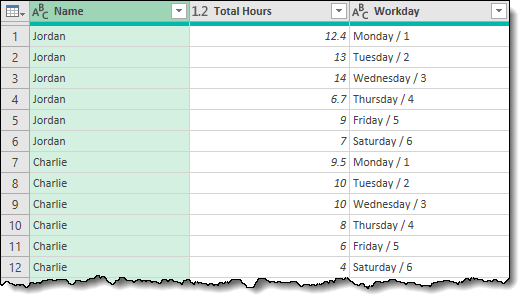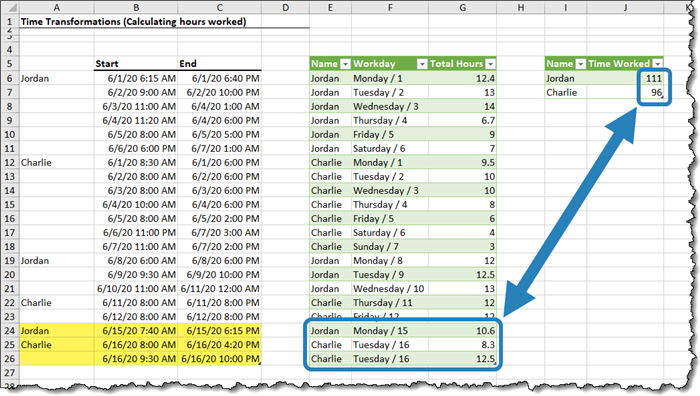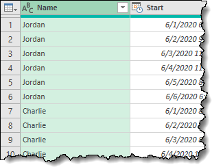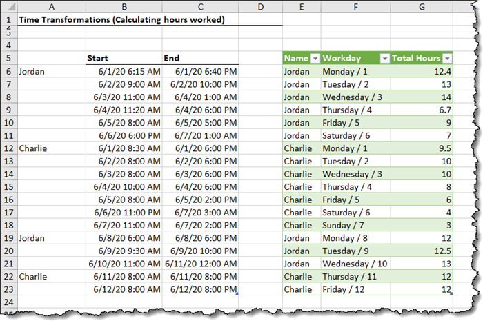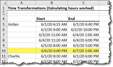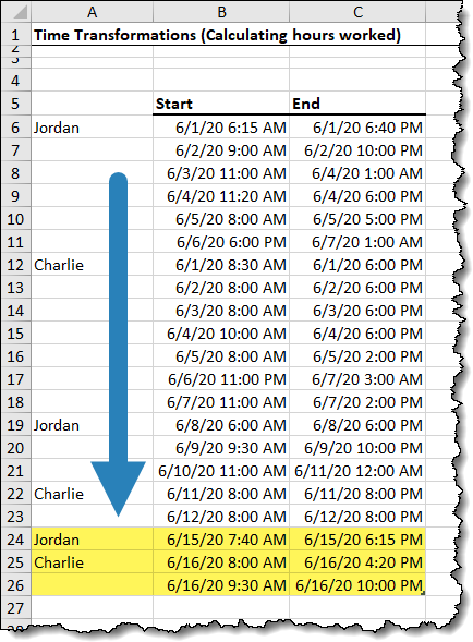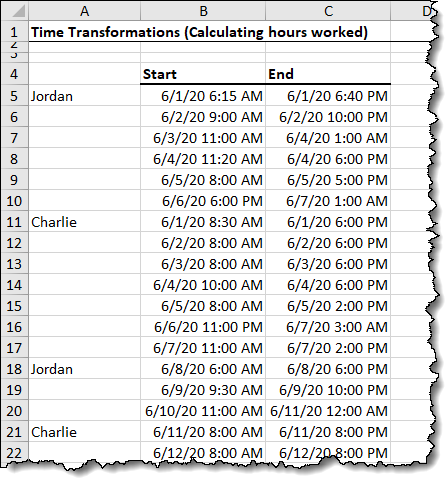 For our example, we have a list of users who record their hours worked by entering their start date/time and end date/time into separate columns. All successive rows of dates/times belong to the listed user until a new user’s name is encountered.