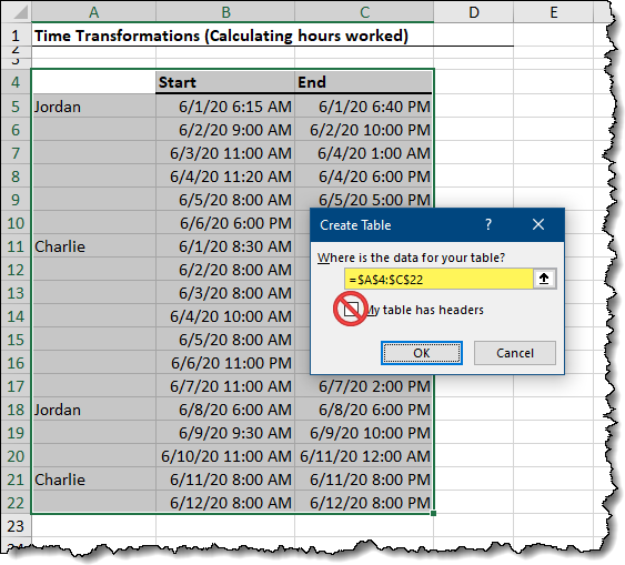 Highlight cells A4 through C22 and press CTRL-T. We will not define a header row in the new table because we don’t want to change the format of the table.