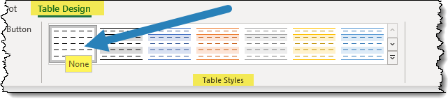 We’ll also remove any of the newly applied colors by setting the table color to “None” from the Table Design (tab) -> Table Styles (group).