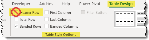We want to use our original header and not the headers that came with the upgrade, so deselect “Header Row” from the Table Design (tab) -> Table Style Options (group).