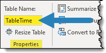 Lastly, we will give the table a proper name of “TableTime” in the Table Design (tab) -> Properties (group) -> Table Name field.