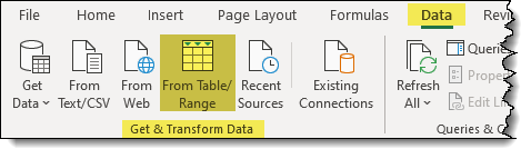 Next, we’ll bring the upgraded table into Power Query by selecting Data (tab) -> Get & Transform Data (group) -> From Table/Range.