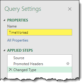 Name the new query “TimeWorked” in the Query Settings -> Properties -> Name field.