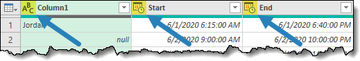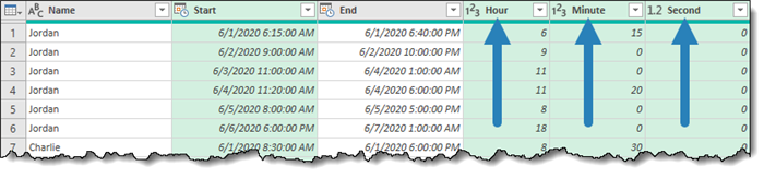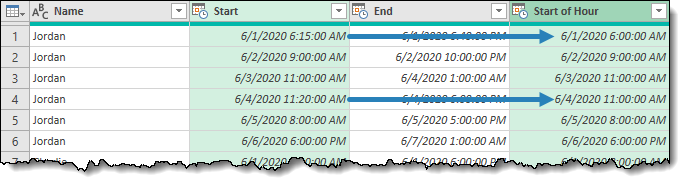For those entries where the user did not start their work at the exact start of the hour, we can “round down” to the nearest hour by selecting Add Column (tab) -> Date & Time Column (group) -> Time -> Hour -> Start of Hour.