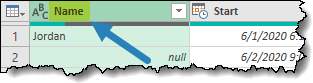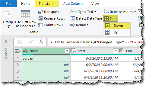 We will repeat the names for each successive empty row with the name that appears above the empty cells. We can do this by selecting Transform (tab) -> Any Column (group) -> Fill -> Down.