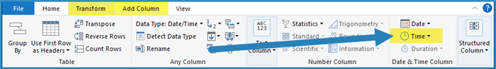 If you need to extract a single component of the time, like the Hour, the Minute, or the Second, you can select Add Column (tab) -> Date & Time Column (group) -> Time -> Hour / Minute / Second.