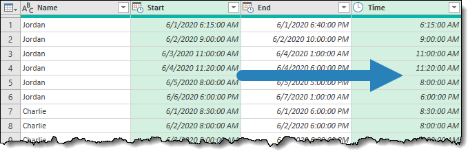 If we want to extract the time component of the “Start” column’s Date/Time, select the “Start” column and click Add Column (tab) -> Date & Time Column (group) -> Time -> Time Only.