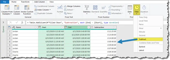 - Select Add Column (tab) -> From Date & Time (group) -> Time -> Subtract.