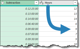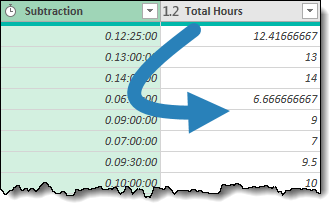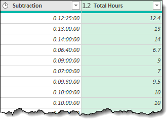 Days.Hours:Minutes:SecondsTo display the result as a number of hours worked, select the results column and click Add Column (tab) -> From Date & Time (group) -> Duration -> Hours. The results are hours rounded down to the nearest hour.