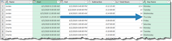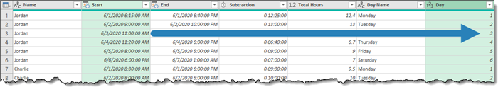 Select the “Start” column and click Add Column (tab) -> From Date & Time (group) -> Date -> Day -> Day.