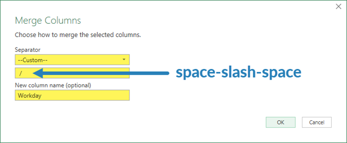 - In the Merge Columns dialog box set the Separator to “Custom” and set the separator to “ / “ (this is a space-forward slash-space combination).