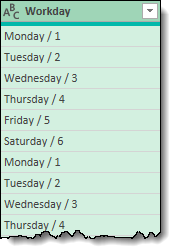 - Select the Day Name and the Day columns (using CTRL or Shift) and click Transform (tab) -> Text Column (group) -> Merge Columns.