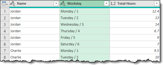 Relocate the “Work Day” field to rest between the “Name” and “Total Hours” columns. Click and hold the heading for the “Work Day” field and drag the field to fall between the first two fields.