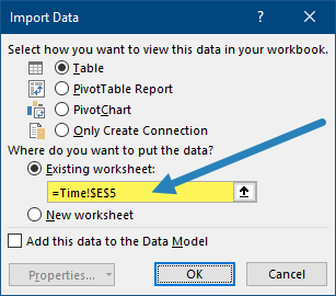 - In the Import Data dialog box, select Table and Existing Worksheet to point to cell E5.