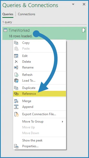 - In the Queries & Connections panel, right-click the “TimeWorked” query and select Reference.