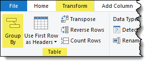 - With the “Name” field selected, click Transform (tab) -> Table (group) -> Group By.