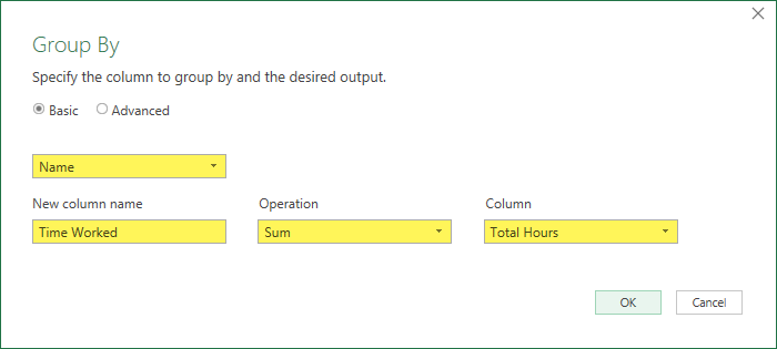 - In the Group By dialog box, set the field to be grouped as “Name”, the new column name to “Time Worked”, and set the operation to Sum using the “Total Hours” field.