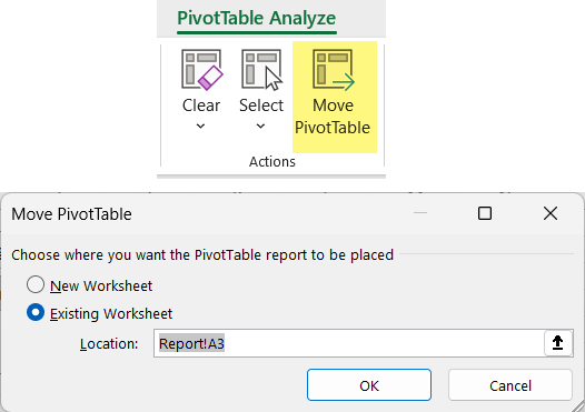If you want to move a pivot table, you will find a handy feature on the PivotTable Analyze tab in the Actions group. It allows you to specify the destination where you want to move the selected pivot table.