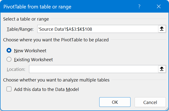 - Confirm the range and choose where you want the Pivot Table to appear.