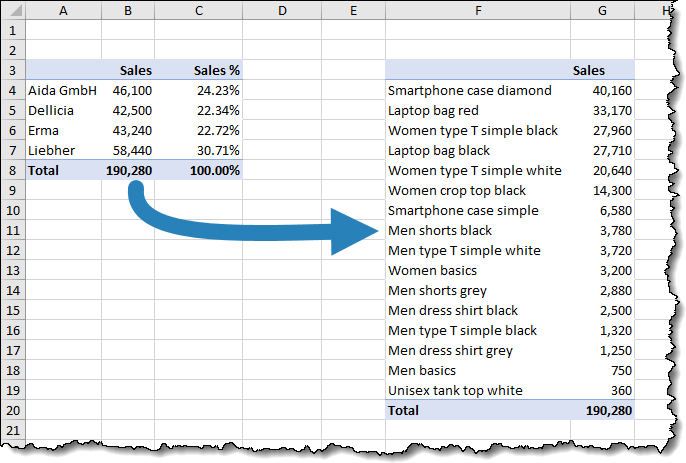 Sales amount shown in the pivot table as actual values and as percentage of grand total (before and after).