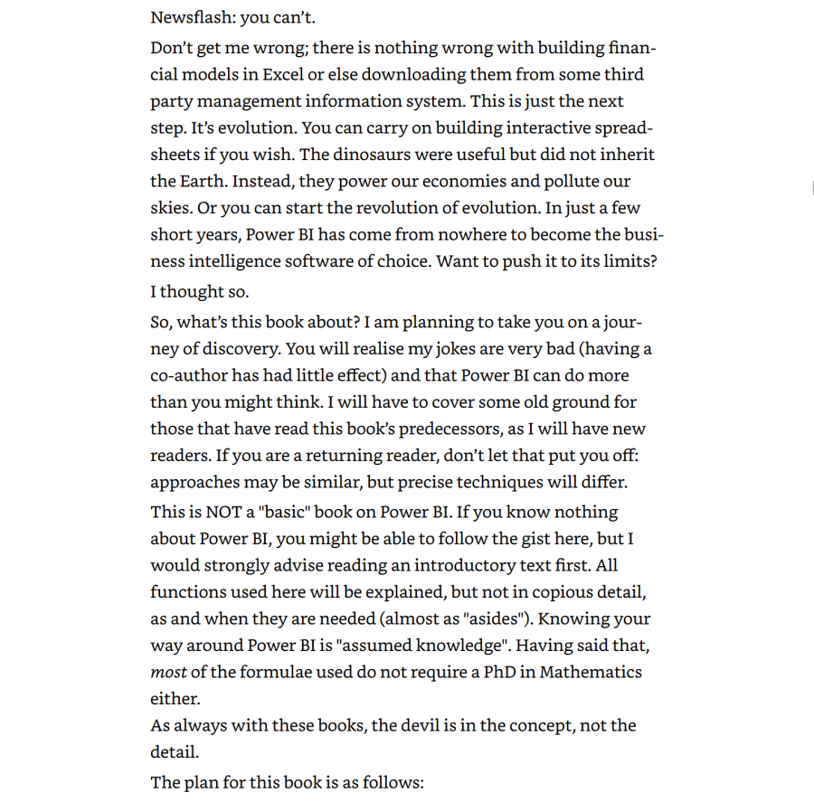 That’s what my friend and MVP colleague Liam Bastick teaches you in his book. Liam has over 30 years experience in developing financial models. He took on a challenge no one dared to take on: Financial Modelling in Power BI.