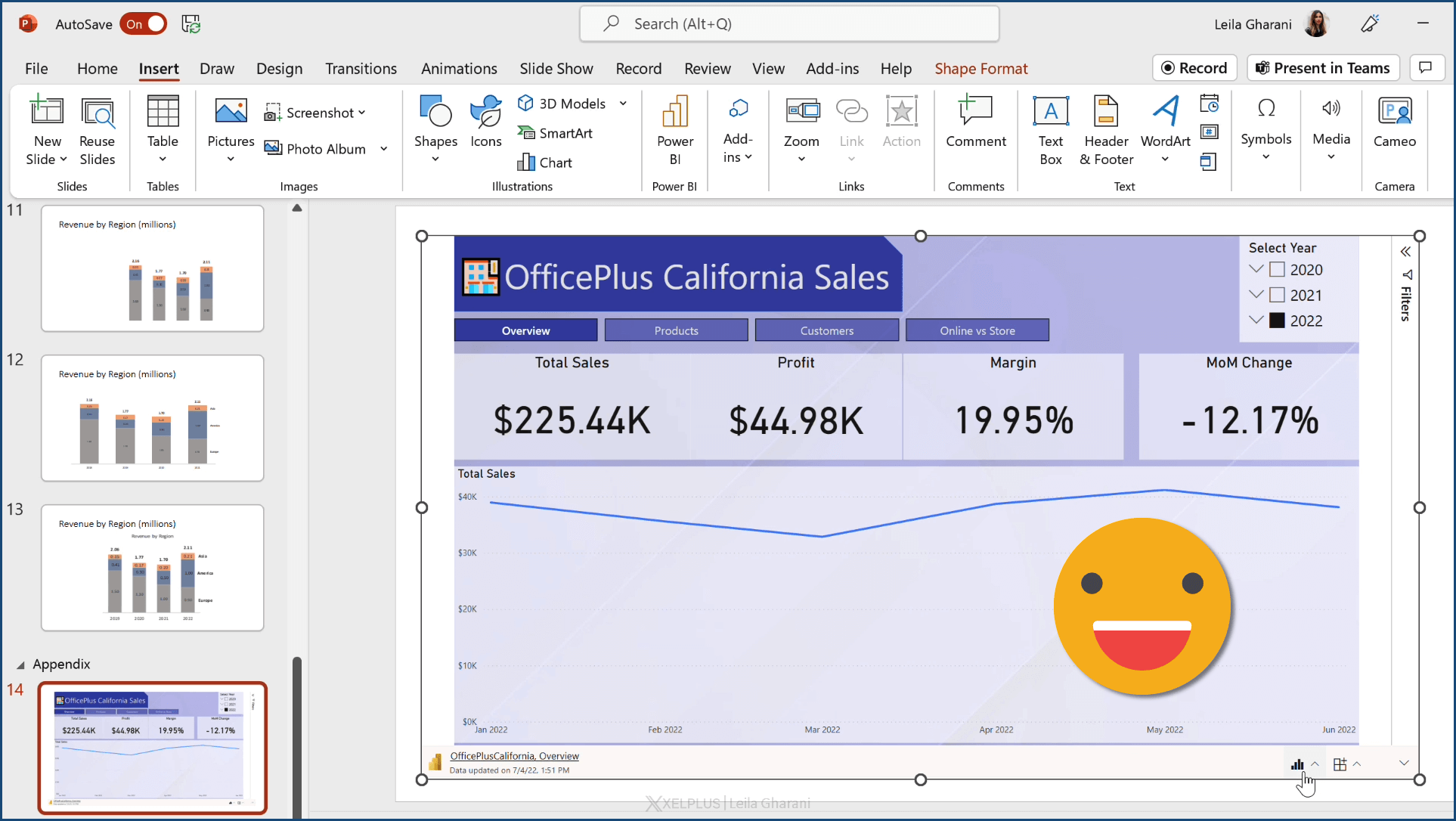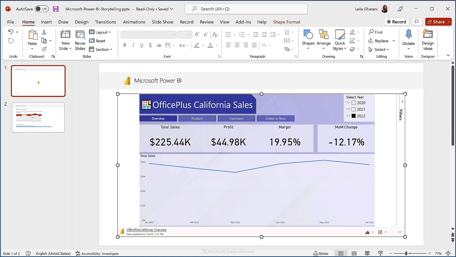 This embedded report is arguably superior to embedding Excel dashboards as Excel’s interactivity does not carry over to PowerPoint.