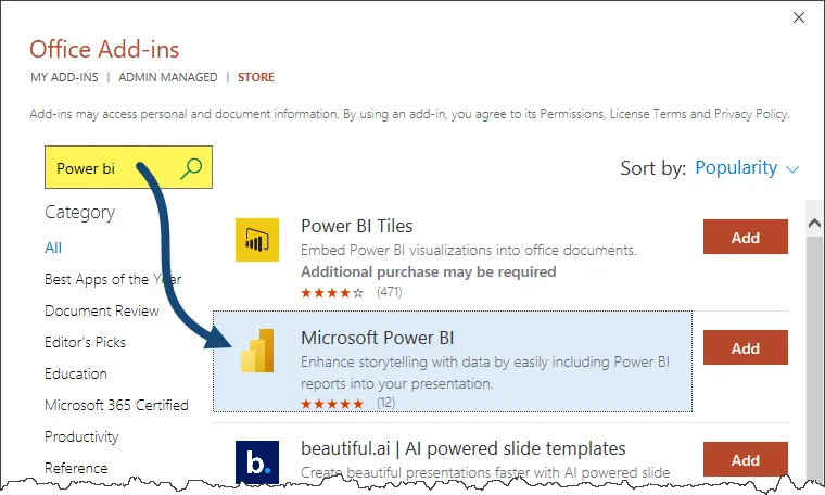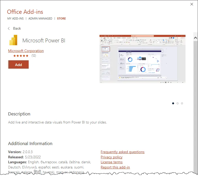 Before we can just drop a Power BI report into PowerPoint as easily as has been demonstrated, you need to first visit the Microsoft Store and download and install the Power BI add-in for PowerPoint.