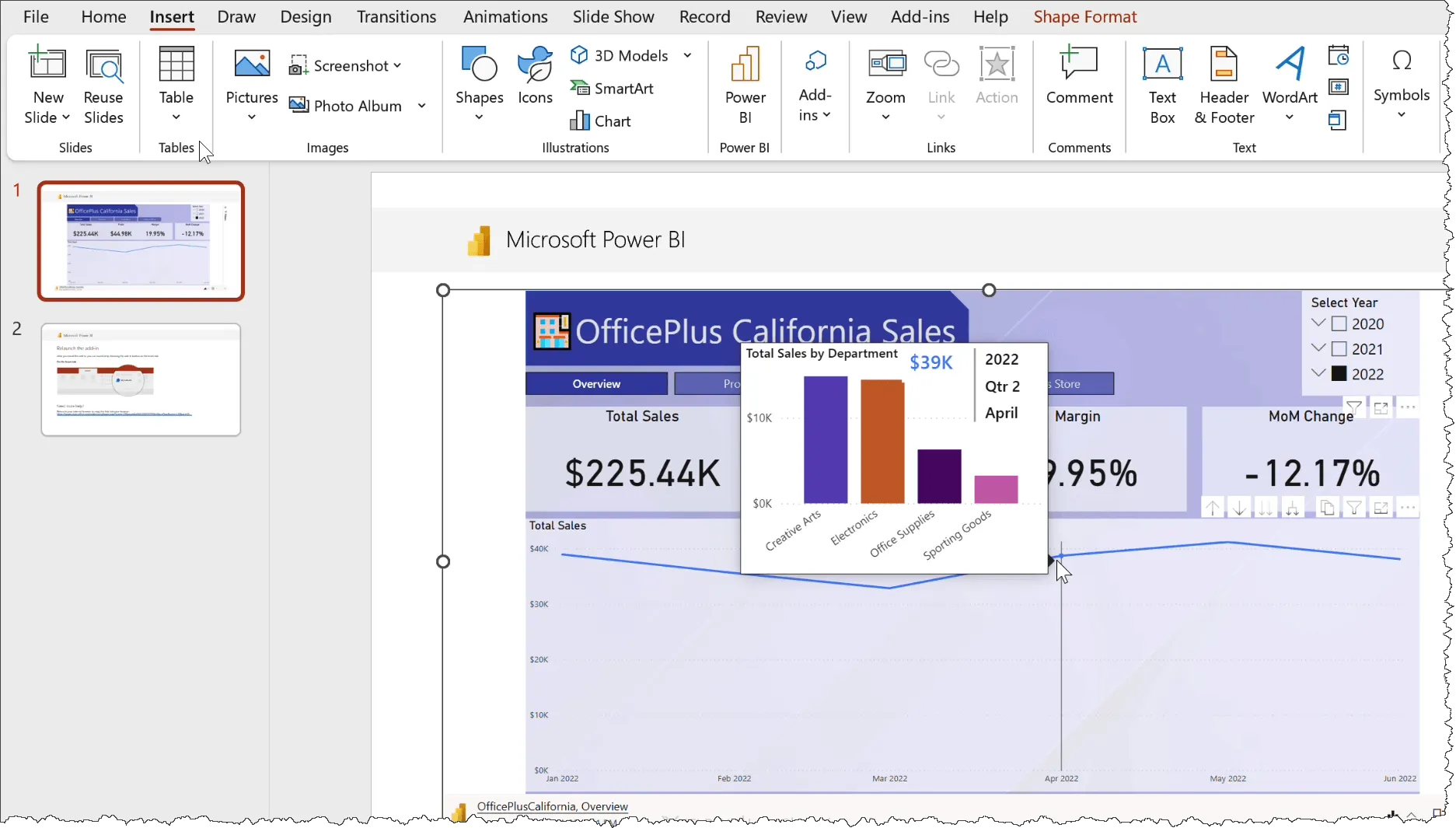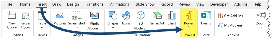 When working with an existing presentation, we can easily add a Power BI report by creating a new, blank slide and selecting Insert (tab) -> Power BI.