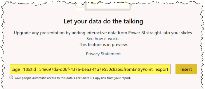 Our slide presents a placeholder that requests the link we saw earlier from the Power Bi service when we perform the initial export routine.