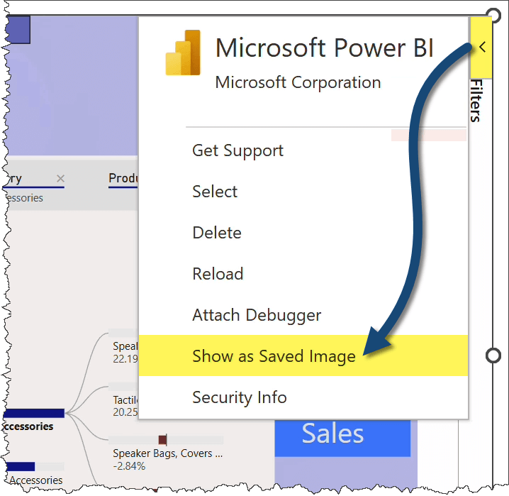 If you need to capture a screenshot of the report during the presentation, click the arrow button in the upper-right corner and select Show as Saved image.